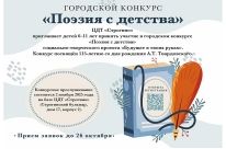 ЦДТ «Строгино» приглашает детей 6–11 лет принять участие в городском конкурсе «Поэзия с детства» — в рамках социально-творческого проекта «Будущее в твоих руках», посвящённого 115-летию со дня рождения А.Т. Твардовского.